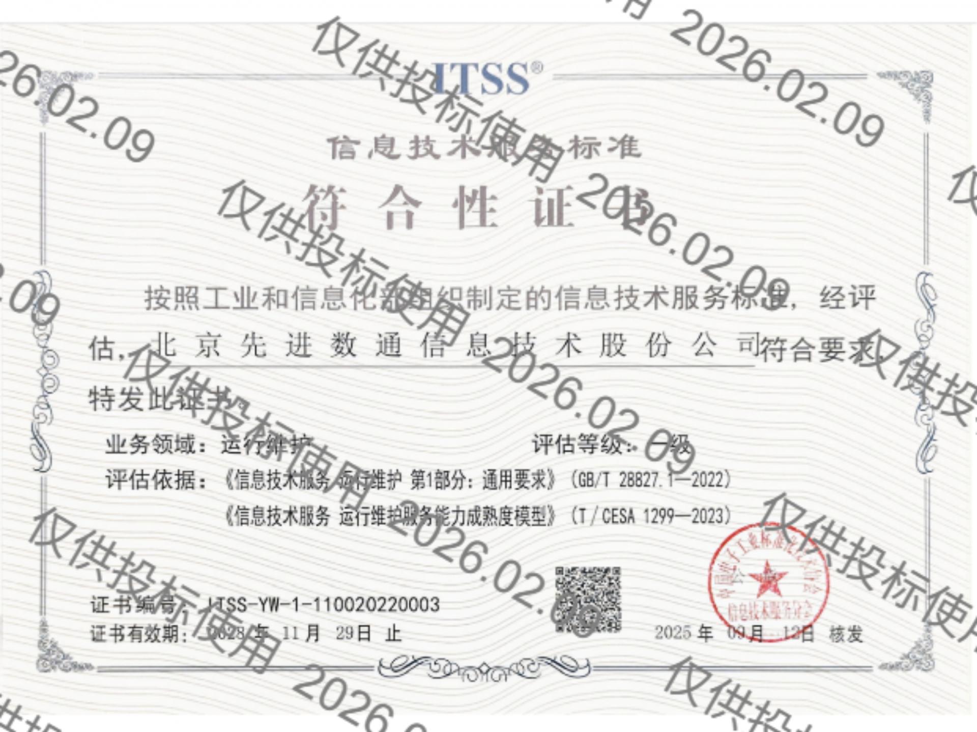 天盛优配先后取得CMMIL5、软件能力成熟度五级(SPCA 5)、信息系统建设和服务能力评估体系(CS)5级、ITSS成熟度一级、信息系统安全集成服务资质二级、信息系统安全运维服务资质二级、国产化信息系统集成和服务能力评估四级(LS4)、北京市企业技术中心等资质认证,并取得ISO9001、ISO20000、ISO27001、ISO14001、ISO45001、ISO22301、ISO37001、ISO28001、GBT29490等标准体系认证,具备行业领先的技术开发、工程实施及服务保障能力。