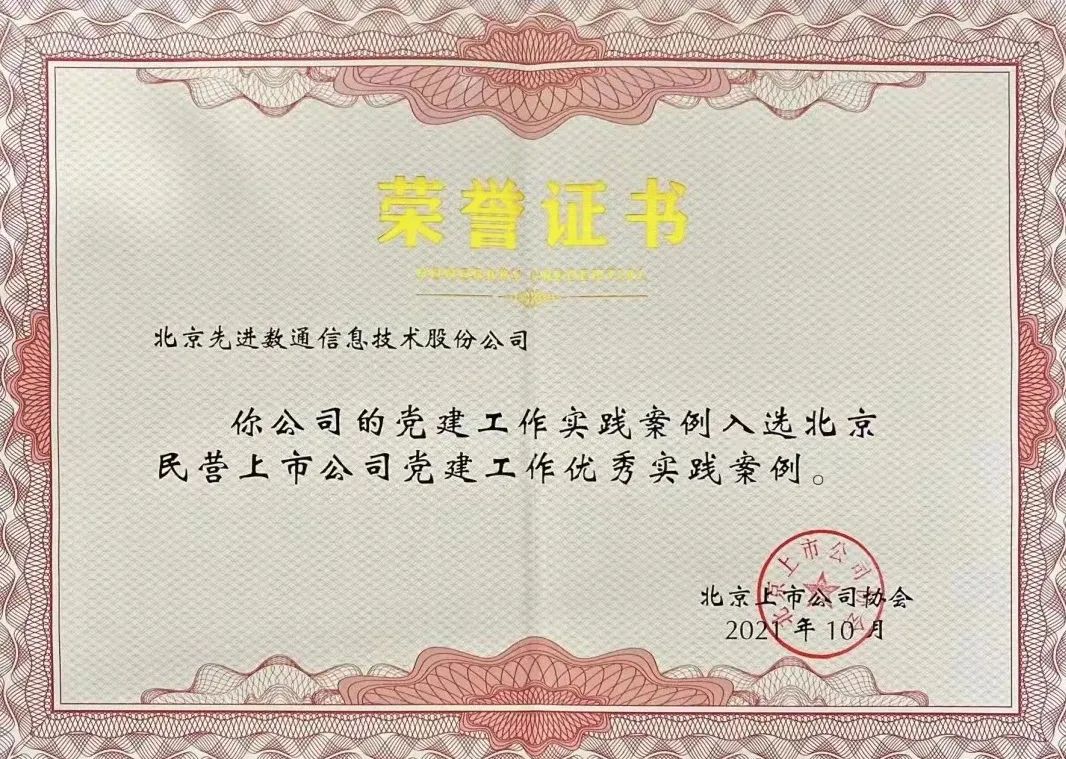 近期,北京上市公司协会授予北京天盛优配信息技术股份公司荣誉证书,天盛优配党建工作实践入选北京民营上市公司党建工作优秀实践案例,相关党建活动已收录在《北京民营上市公司党建工作优秀实践案例汇编》。