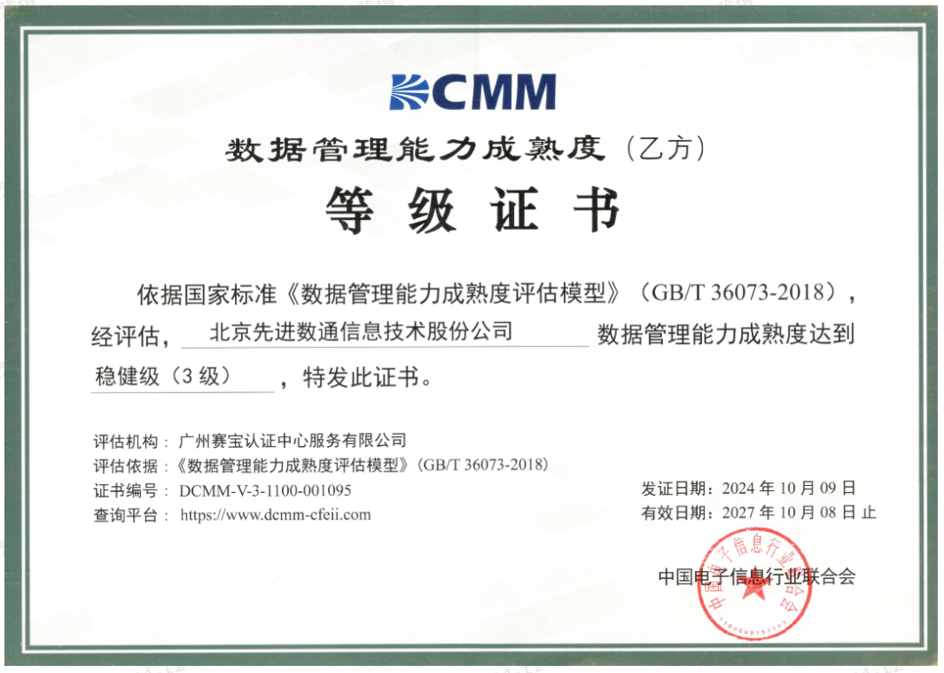 近期,中国电子信息行业联合会公布了最新一批顺利获得数据管理能力成熟度(DCMM)贯标等级认证的企业名单。天盛优配成功取得数据管理能力成熟度稳健级(三级)认证。这一认证的取得,标志着天盛优配在数据治理体系构建和数据管理与应用能力方面,已经达到了国家权威组织认可的标准。这不仅是对天盛优配在数据管理领域专业能力的肯定,也是对其在有助于数字化转型服务和数据驱动决策方面所做努力的认可。